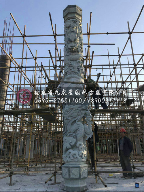 龍柱就是柱子上雕有蟠龍,雕龍柱大多采用浮雕,蟠龍的形象比較突出,而其中最為精彩的是高浮雕手法雕制而成的龍柱,龍紋更具立體感,更為生動。九龍星園林古建雕刻的龍柱龍形生動如生,雕刻技藝精湛。